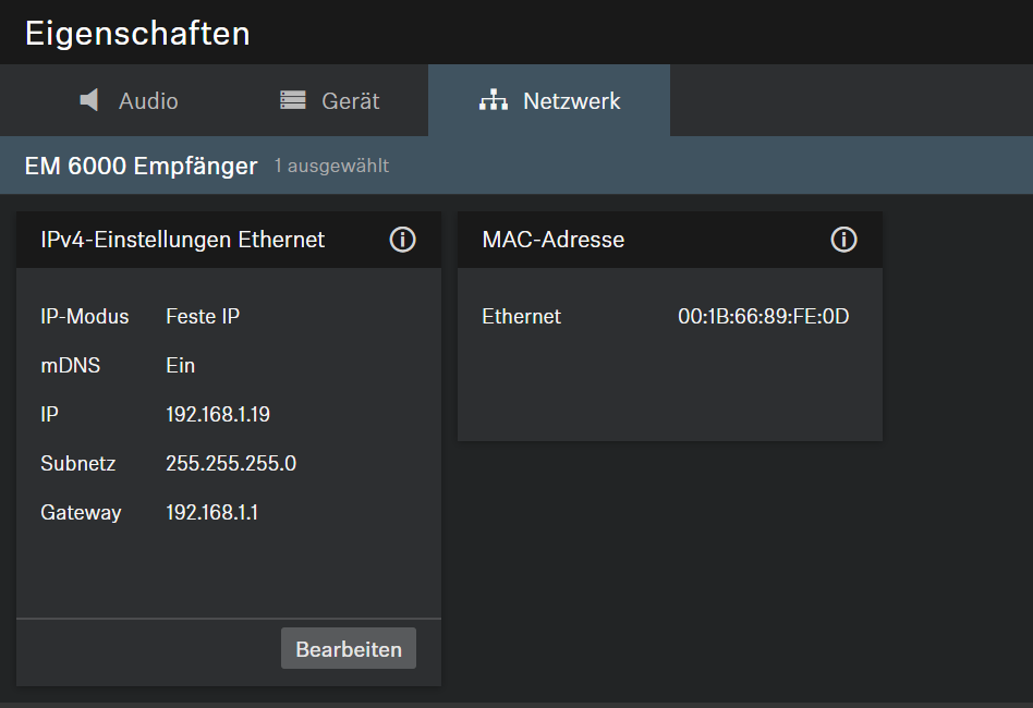 - Automatisch: Die IP-Adresse wird automatisch per DHCP zugewiesen. Falls kein DHCP-Server vorhanden ist, der eine IP-Adresse vergibt, wird die IP-Adresse vom SL Rack Receiver DW selbst zugewiesen.