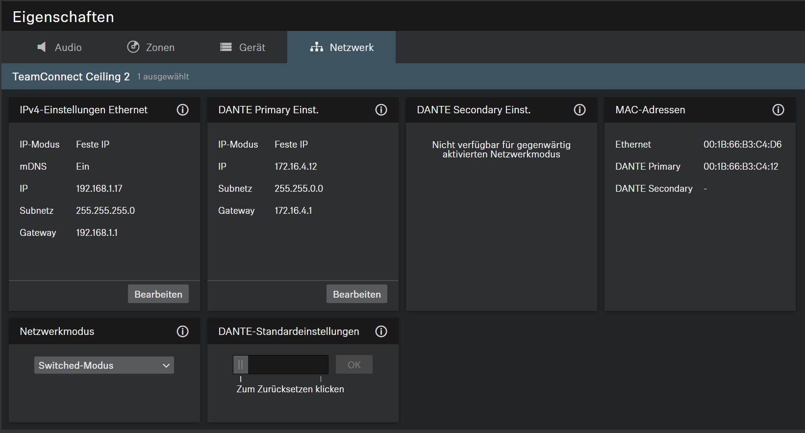 Zeigt die IP-Adresse, das Subnetz und den Gateway des sekundären DANTE-Ports an. Sie können die Einstellungen bearbeiten, wenn Sie den Netzwerkmodus Audio-Redundanzmodus verwenden.
