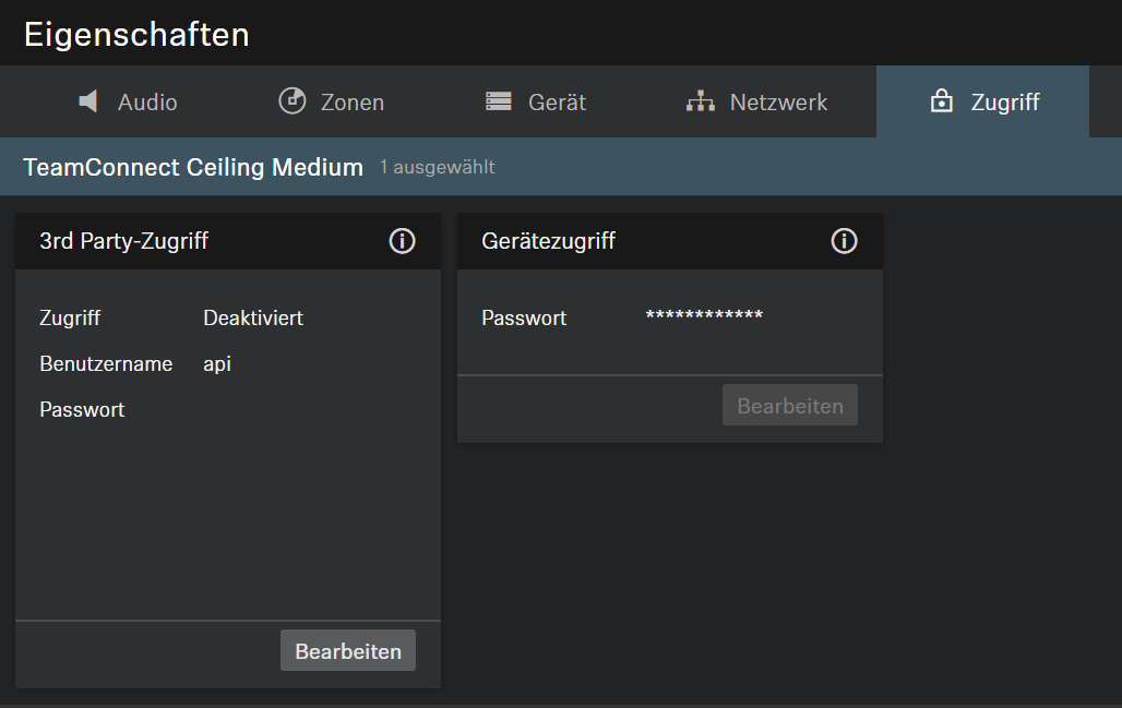 Der 3rd Party-Zugriff auf die Mediensteuerung für das TeamConnect Ceiling Medium ist verschlüsselt und mit Benutzername und Passwort geschützt. Er muss vor der Verwendung über das Control Cockpit aktiviert werden.