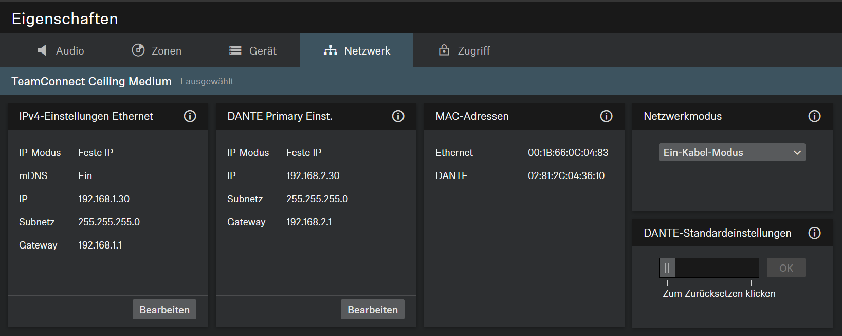 Zeigt die IP-Adresse, das Subnetz und den Gateway des sekundären DANTE-Ports an. Sie können die Einstellungen bearbeiten, wenn Sie den Netzwerkmodus Audio-Redundanzmodus verwenden.