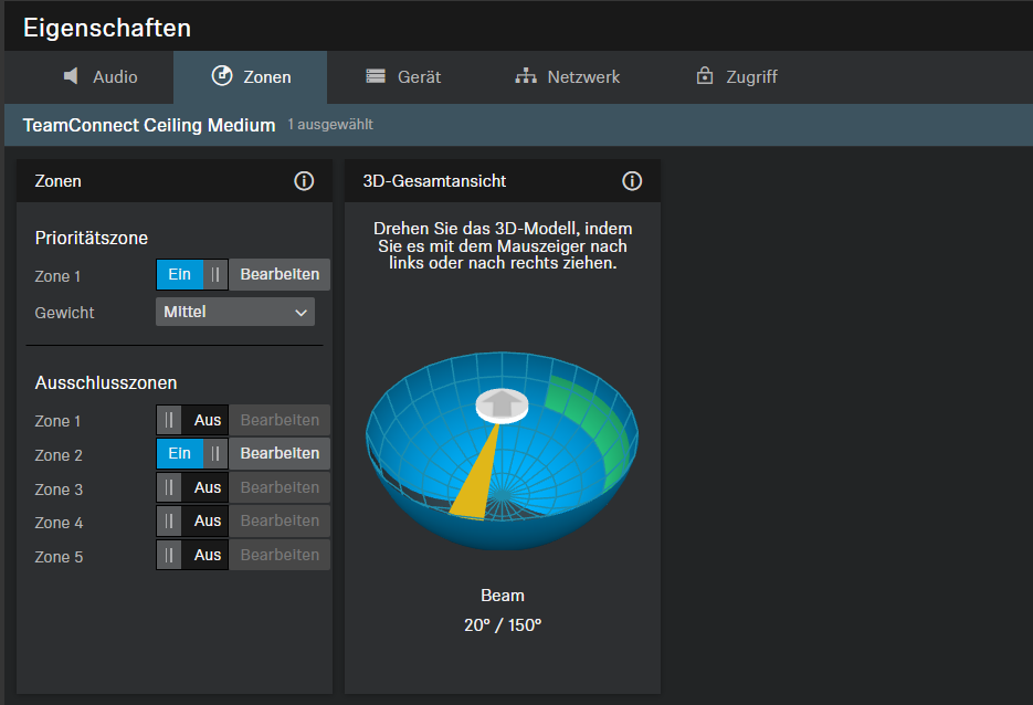 Mit dem TeamConnect Ceiling können Sie bis zu 5 Ausschlusszonen definieren. Durch Aktivieren dieser Zonen werden die ausgehenden Audiosignale aus diesen Bereichen ignoriert. Erfahren Sie mehr darüber in Einrichten von Zonen.