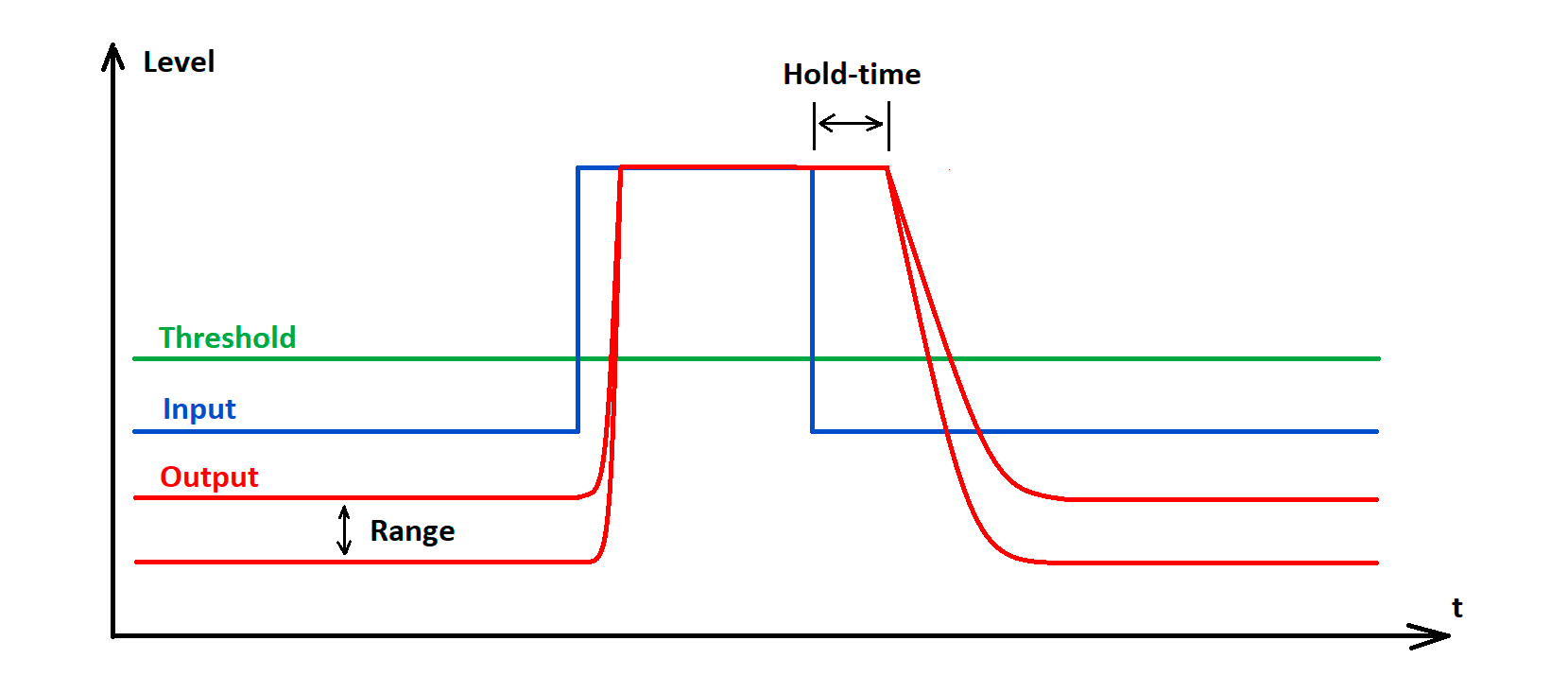 Der Parameter „Bereich“ bestimmt den Grad der Geräuschunterdrückung unterhalb des eingestellten Schwellenwerts für das gesamte Noise-Gate. Der Parameter kann in Schritten von 1 dB zwischen 0 dB (keine Unterdrückung) und 80 dB (der Pegel wird unterhalb des Schwellenwerts und nach der „Attack-Zeit“ um 80 dB reduziert) eingestellt werden.