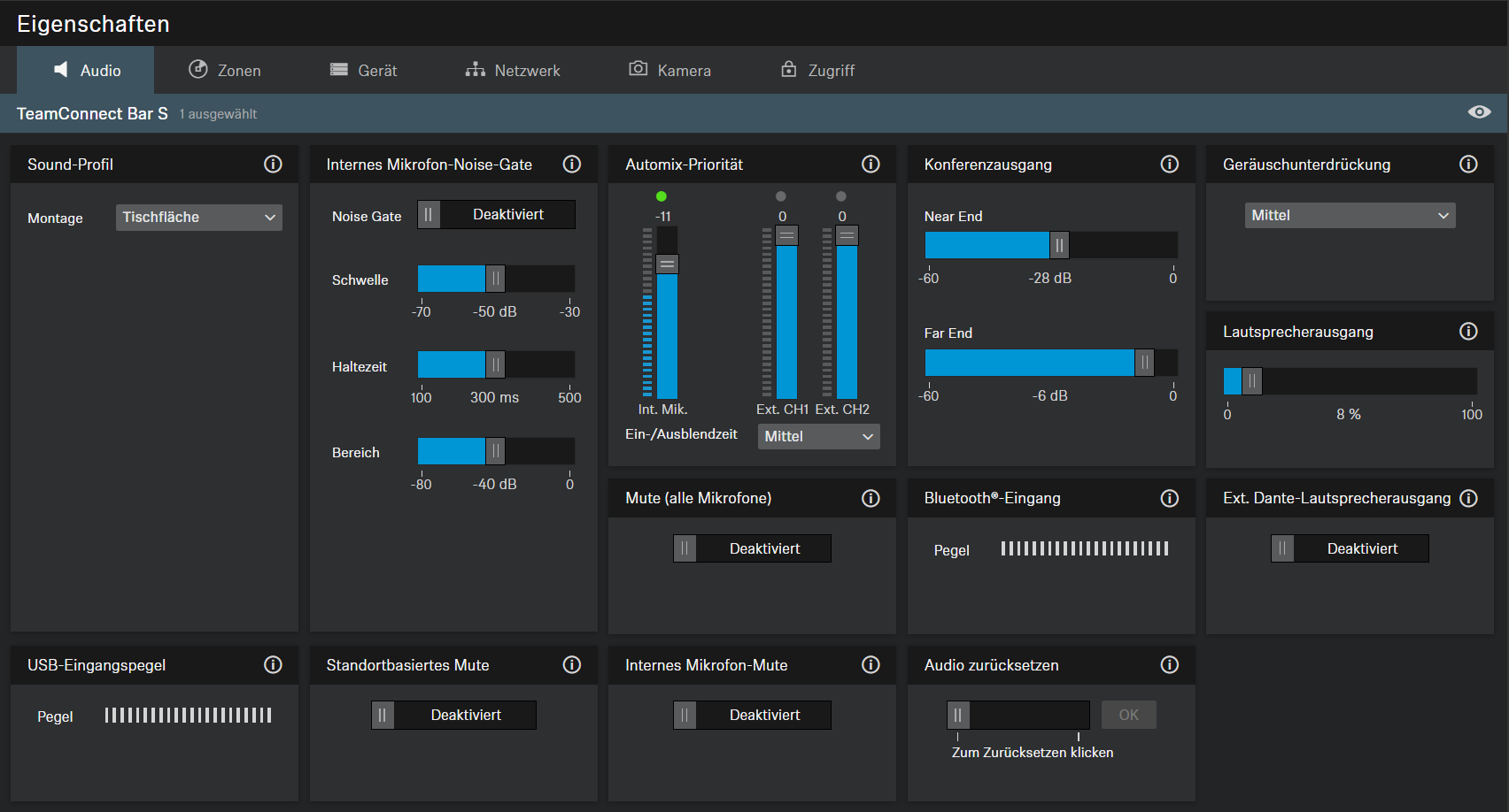 Die Dante-Eingänge werden über einen integrierten Automixer verwaltet, wobei die Priorität der Kanäle, einschließlich des internen Mikrofon-Arrays, über einzelne Fader eingestellt werden kann. Die Senkung des Pegels mit dem entsprechenden Fader fügt dem Kanal eine virtuelle Reduzierung des Pegels hinzu, sodass die Wahrscheinlichkeit sinkt, vom Automixer ausgewählt zu werden.