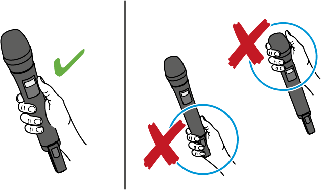 If you cover the antenna of the handheld transmitter during transmission, the transmission range will be considerably reduced. If you cover the microphone head during transmission, this will change the pick-up pattern of the microphone and consequently the sound.