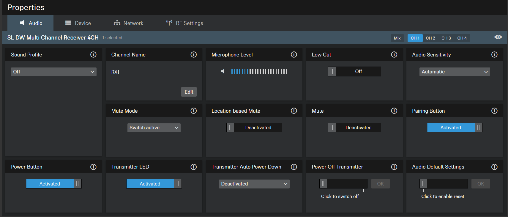 Deactivated: The transmitter is not part of a mute group. Muting or unmuting does not affect other transmitters.