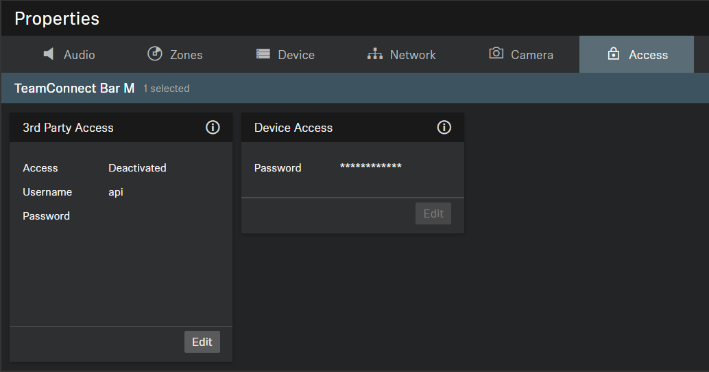 - Enables or disables 3rd party media control access. In order to enable, select the Edit button, activate the toggle switch, enter a 3rd party device password and select the OK button.