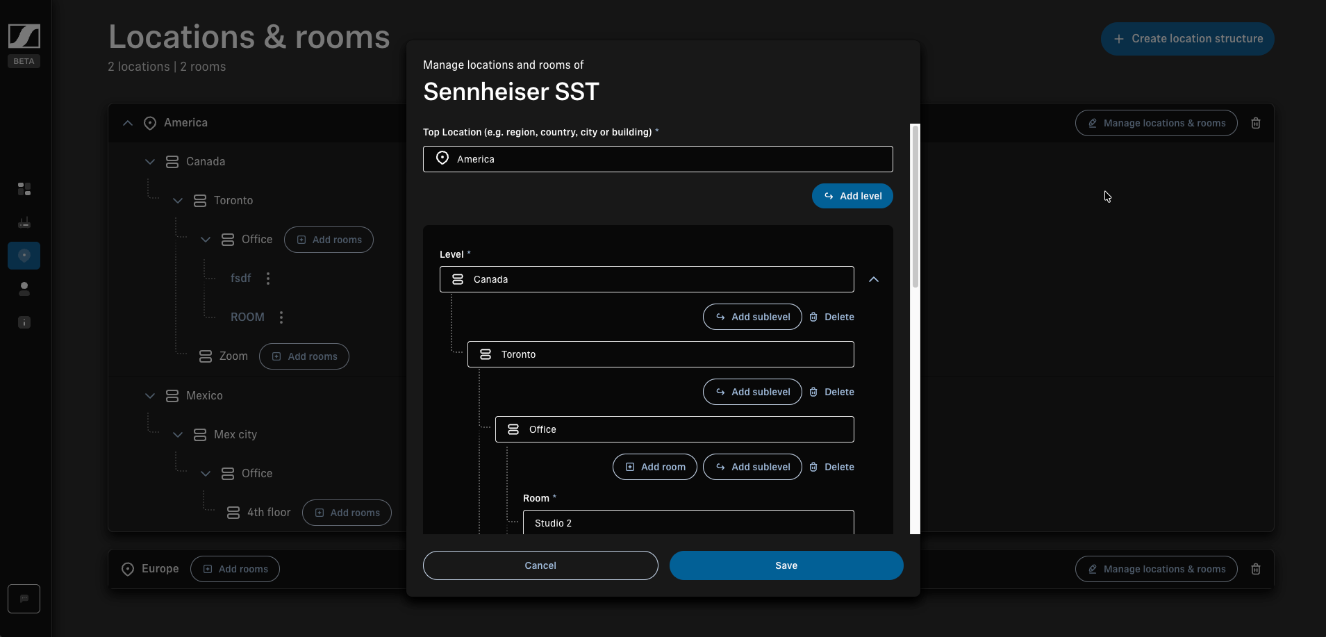 Manage your location and room structure by adding, deleting, or renaming entries.