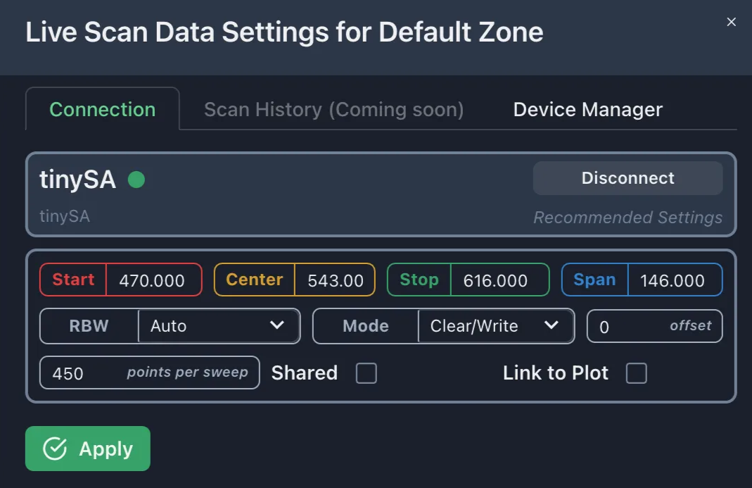 switched off. Connect and switch on the device only when the Live Scan Data Settings