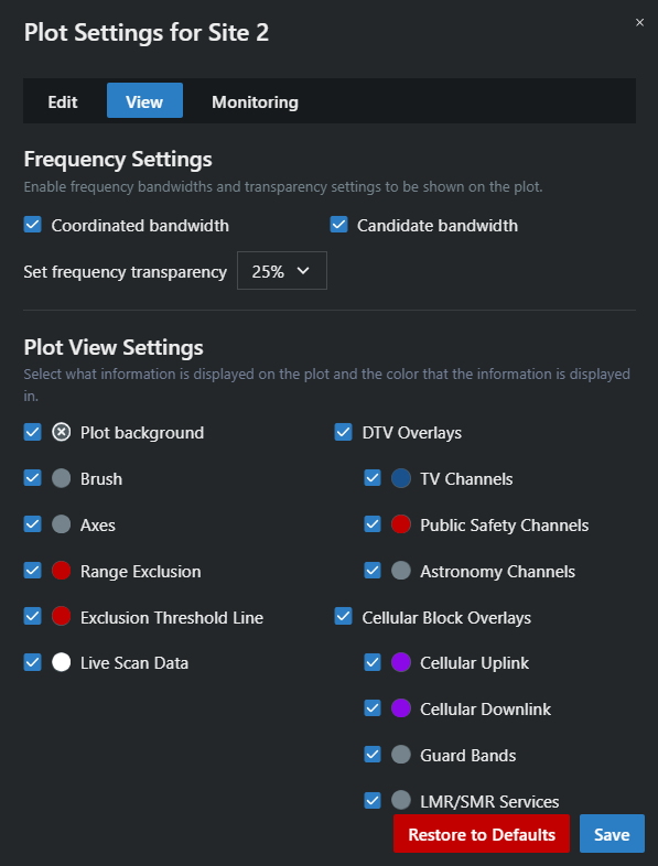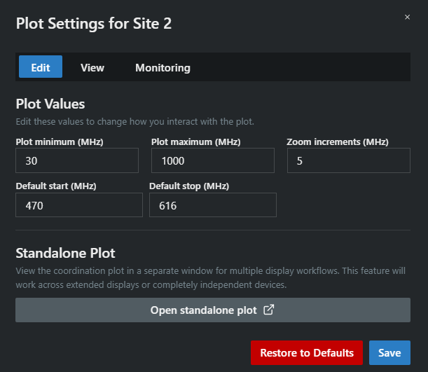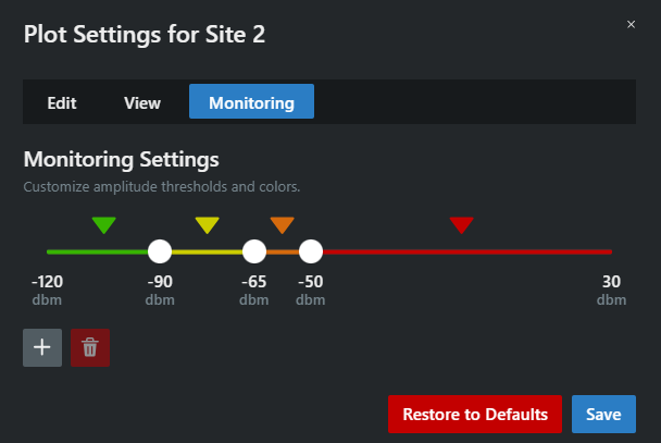Customize plot settings Here you can customize the plot settings for your selected site. To customize the plot settings: In the frequency plot, click on the button. A new window opens. In the Edit tab: Adjust the plot minimum, plot maximum, and zoom increments Set the default start and stop values Open a standalone plot in a separate display. In the View tab: Select whether to display frequencies in the plot as profile bandwidth Adjust the transparency level of frequencies shown in the plot Choose which information to show on the plot and select its display color. In the Monitoring tab: Customize the amplitude thresholds and colors based on the dB value. Your plot settings have been customized.