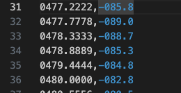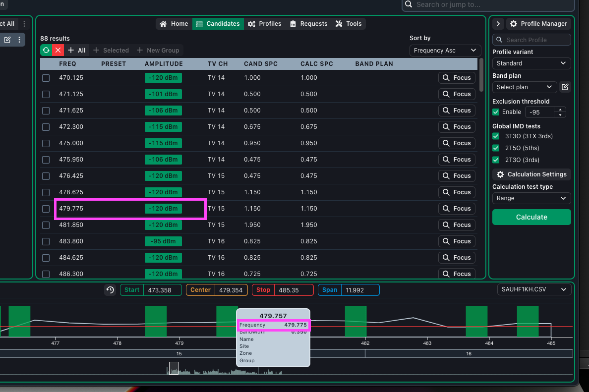 Visually, it looks like this candidate should be considered above the exclusion threshold. However, if we look at the captured data points for this area, there are not enough data points available to reliably calculate whether the measured data is actually above the threshold line. If there is no nearby data point, then the candidate AMPLITUDE column reports -120 (the minimum value on the plot).