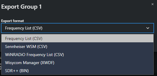 Exporting groups You can export your created group. To export a group: In the Coordination area, click the group's menu button . A new form opens. Select the format to be exported as. Click on Export. Groups have been exported.