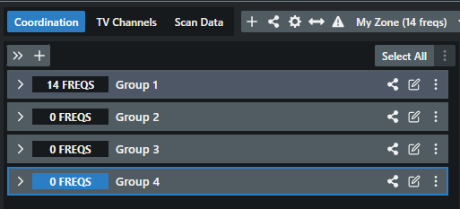 - In a concert with a single band performing, Groups can be used to organize frequencies by device type and usage. For instances, Mics, Backline, and In-ears can each form a Group.