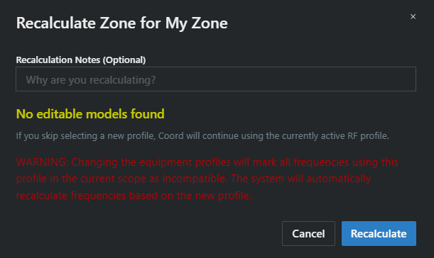 You can recalculate incompatible frequencies in your selected zone by choosing an optional equipment profile.