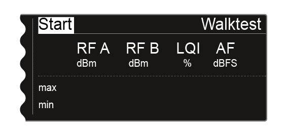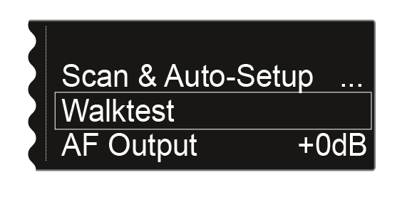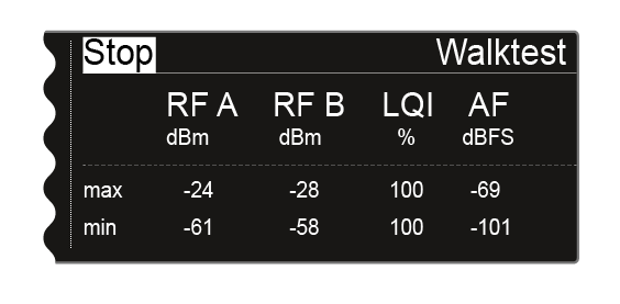 Start the walktest function in this menu item and then walk the entire area with one transmitter. The results of the walk test give you information about the reception quality.