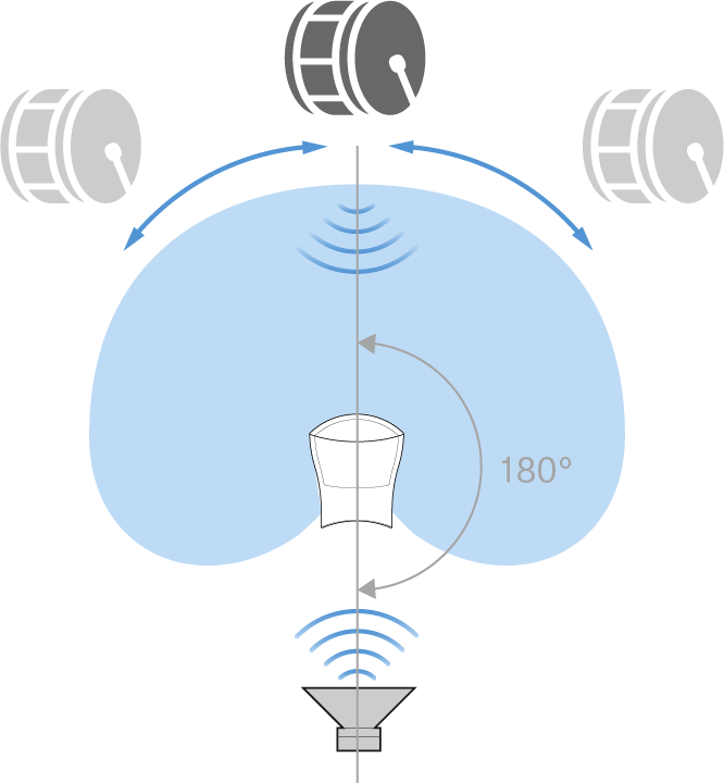 To prevent feedback and crosstalk, postion your monitor loudspeakers in the angle area of the highest cancellation of the microphone (approx. 180°).