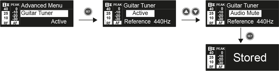 In the Guitar Tuner menu item of the Advanced submenu, you can adjust the options of the guitar tuner.