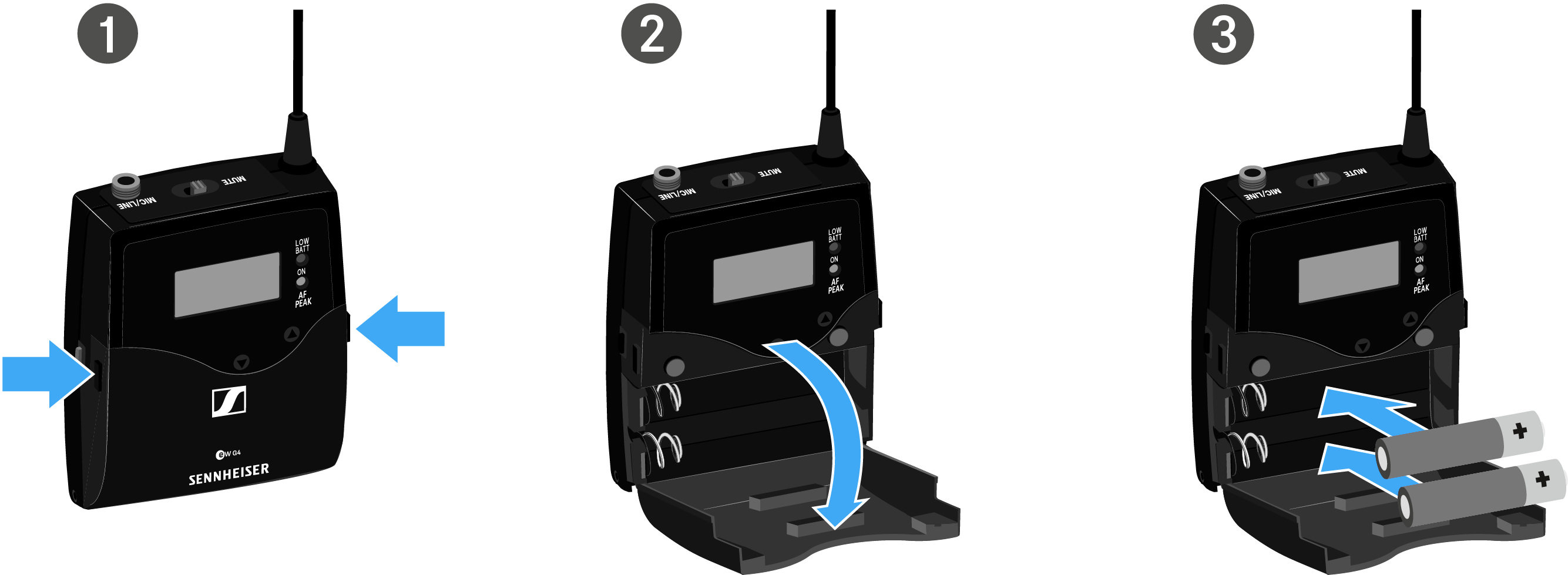 You can operate the bodypack transmitter either with batteries (AA, 1.5 V) or with the rechargeable Sennheiser BA 2015 battery.