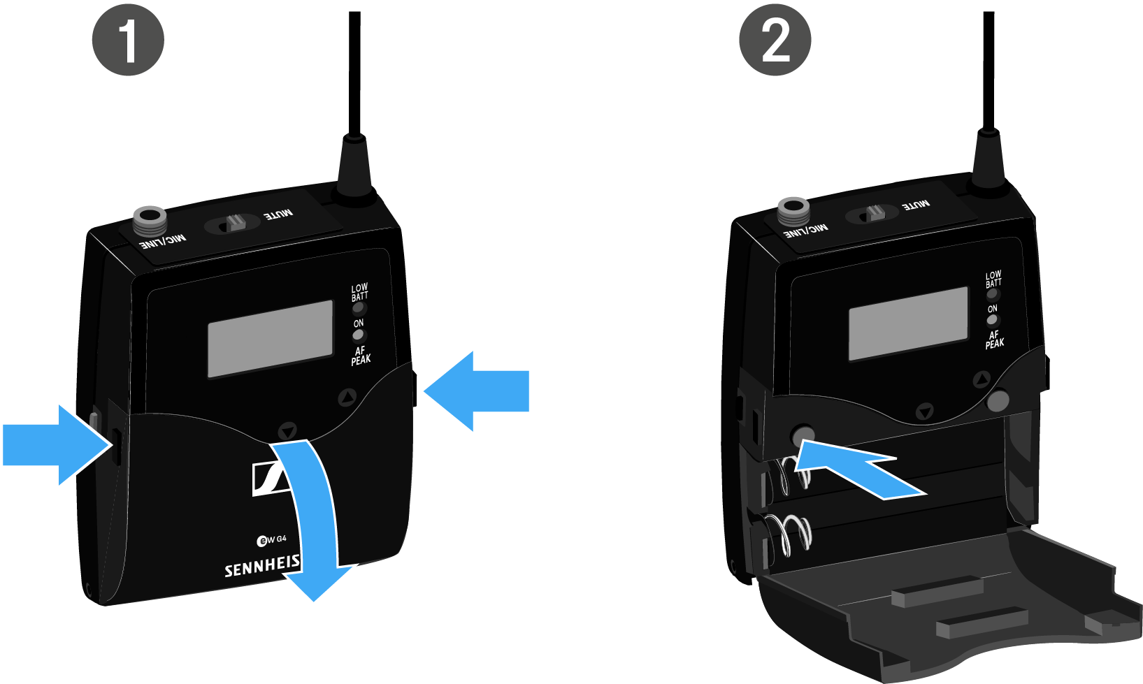 - Press the two catches and open the battery compartment cover.