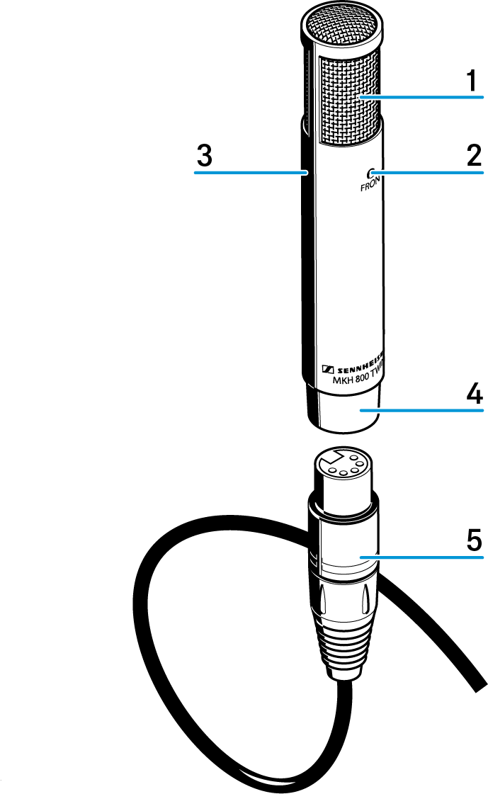 Product overview 1 Sound inlet basket 2 LED Front (blue) 3 LED Rear (red) 4 XLR-5 connector 5 AC 20 adaptor cable