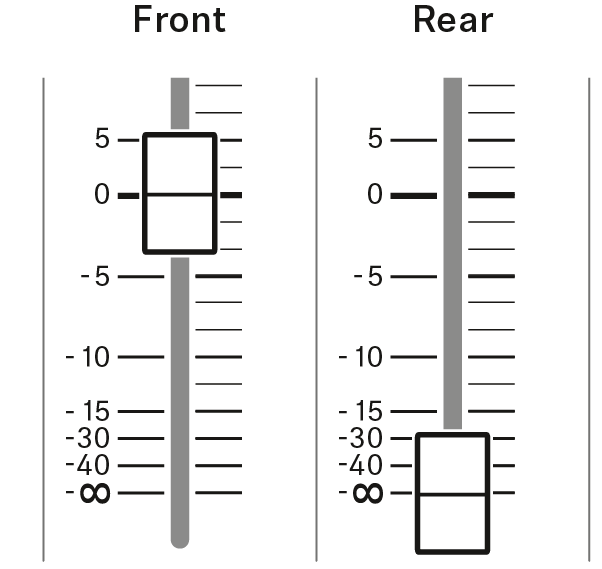 As a result of the symmetry of the microphone, it is also possible to create any desired rear pick-up pattern. For this purpose the microphone signals are additionally routed to two other channels, whereby front and rear channel exchange roles. The settings are then made in the same way as described above and the rear pick-up patterns can be freely selected. Both pick-up patterns are then available simultaneously, for example for a surround front channel and a surround rear channel. With two MKH 800 TWIN, four surround channels can be created in this way.