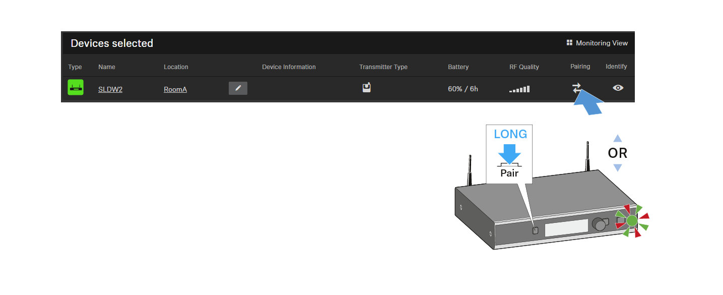 Once the radio link is successfully established, Paired appears on the display panel of both the receiver and the transmitter (only for SL Handheld DW and SL Bodypack DW) and the status LEDs on the transmitter and the receiver light up green. If no radio link was successfully established, Pairing failed appears on the display panel of both the receiver and the transmitter (only for SL Handheld DW and SL Bodypack DW) and the status LEDs on the transmitter and the receiver light up red. If you try to pair devices that are running incompatible firmware versions, a message appears on the display panel prompting you to update the firmware of the transmitter.Wenn If you update the firmware now, the transmitter and the receiver will be paired afterwards