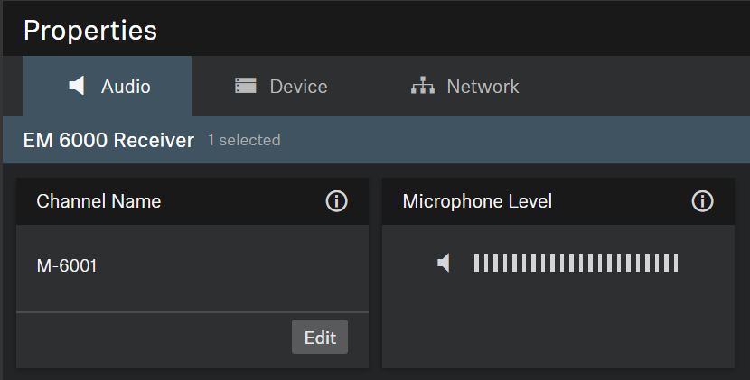 Audio Settings The following settings can be adjusted in the audio tab. Channel Name Displays the name of the channel. Microphone Level Displays the microphone level.