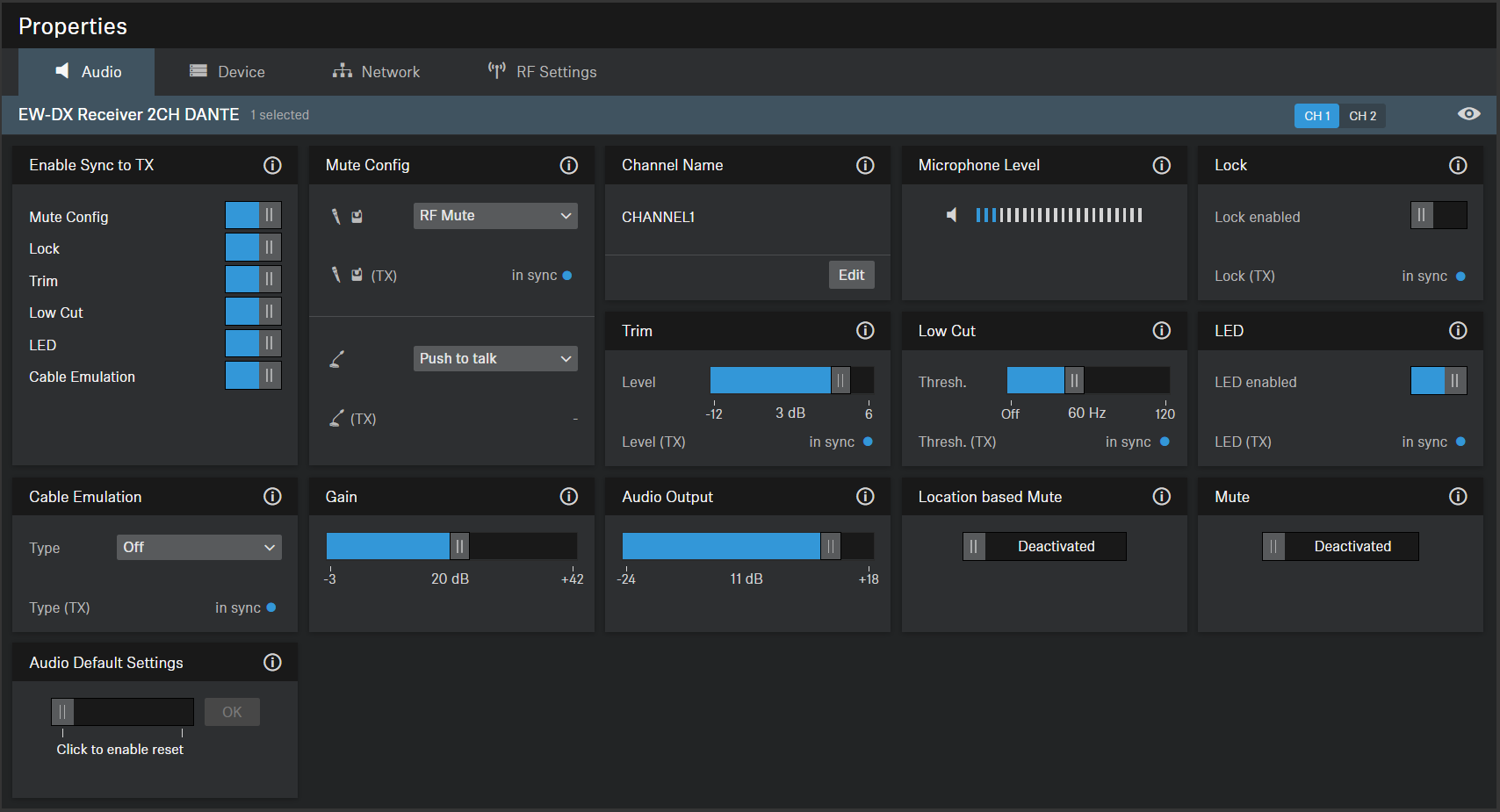 The following settings can be adjusted for wireless links with the EW-DX EM 2, EW-DX EM 2 Dante and EW-DX EM 4 Dante in the audio tab.