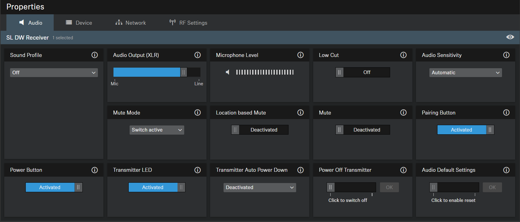 The following settings can be adjusted for wireless links with the SL Rack Receiver DW in the audio tab.