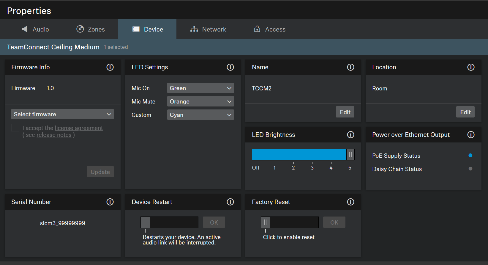Adjusts the color of the four LEDs in the corners of the ceiling microphone array.
