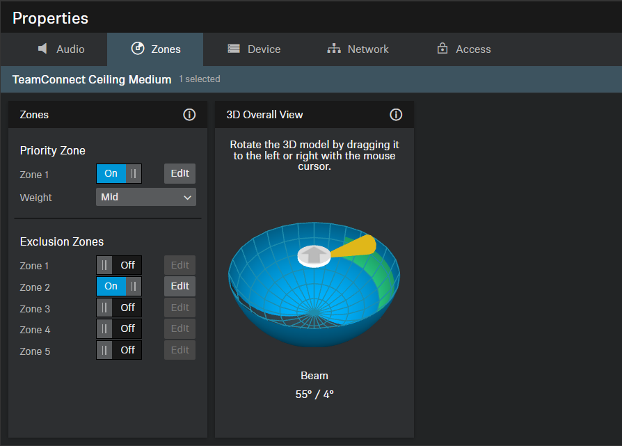 TeamConnect Ceiling allows you to define up to 5 Exclusion Zones. By activating these zones all outgoing audio signals from these areas will be neglected. You can learn more about this topic in Setting up zones.
