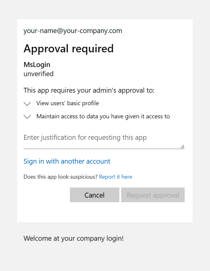 Depending on your customer tenant configuration, you may be required to complete your configured MFA challenge, such as Authenticator App, Passkeys, SMS, etc. This additional MFA depends entirely on your configuration.If you are the first user in your company to use the Microsoft login from Sennheiser, it may happen that your administrator needs to approve the connection to Sennheiser. If this is the case, you are redirected to a page similar to this, where you are asked to enter a reason for the request (see Admin approval to enable trust between tenants).