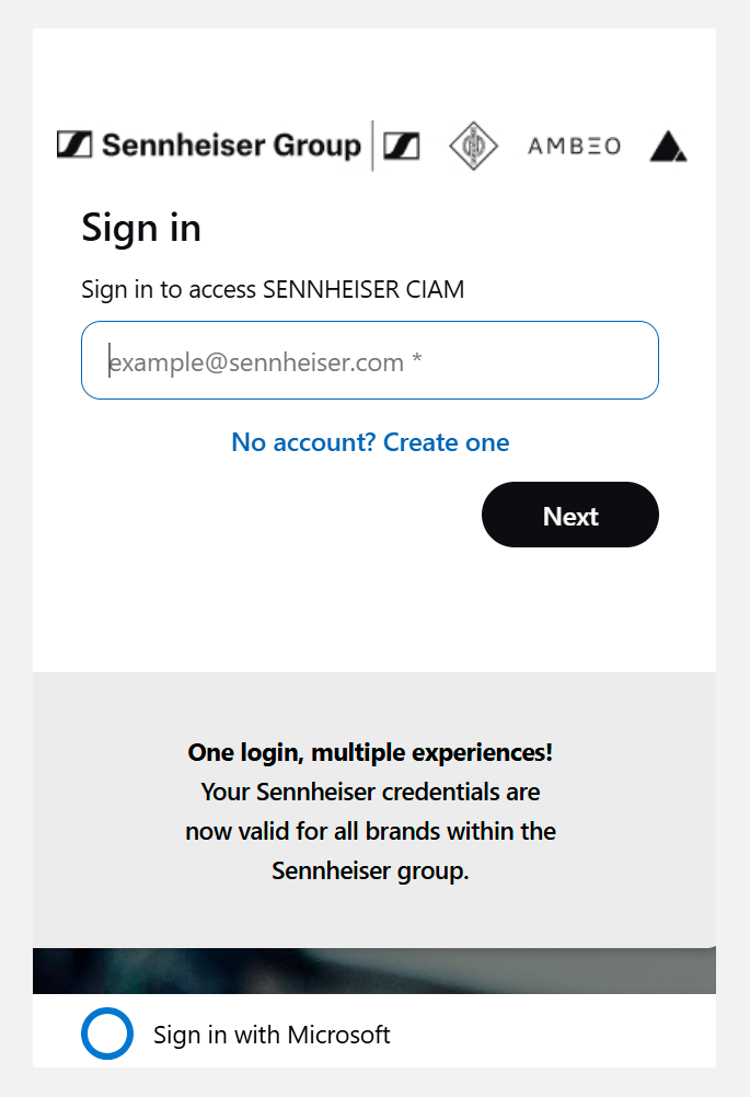 Register with the Sennheiser Identity Platform using your existing Microsoft account from your customer tenant and provide the requested additional information.