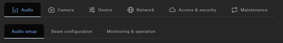 Audio The following settings can be managed via the audio tab. The Audio tab is divided into following sections: Audio Setup Beam configuration Monitoring & operation