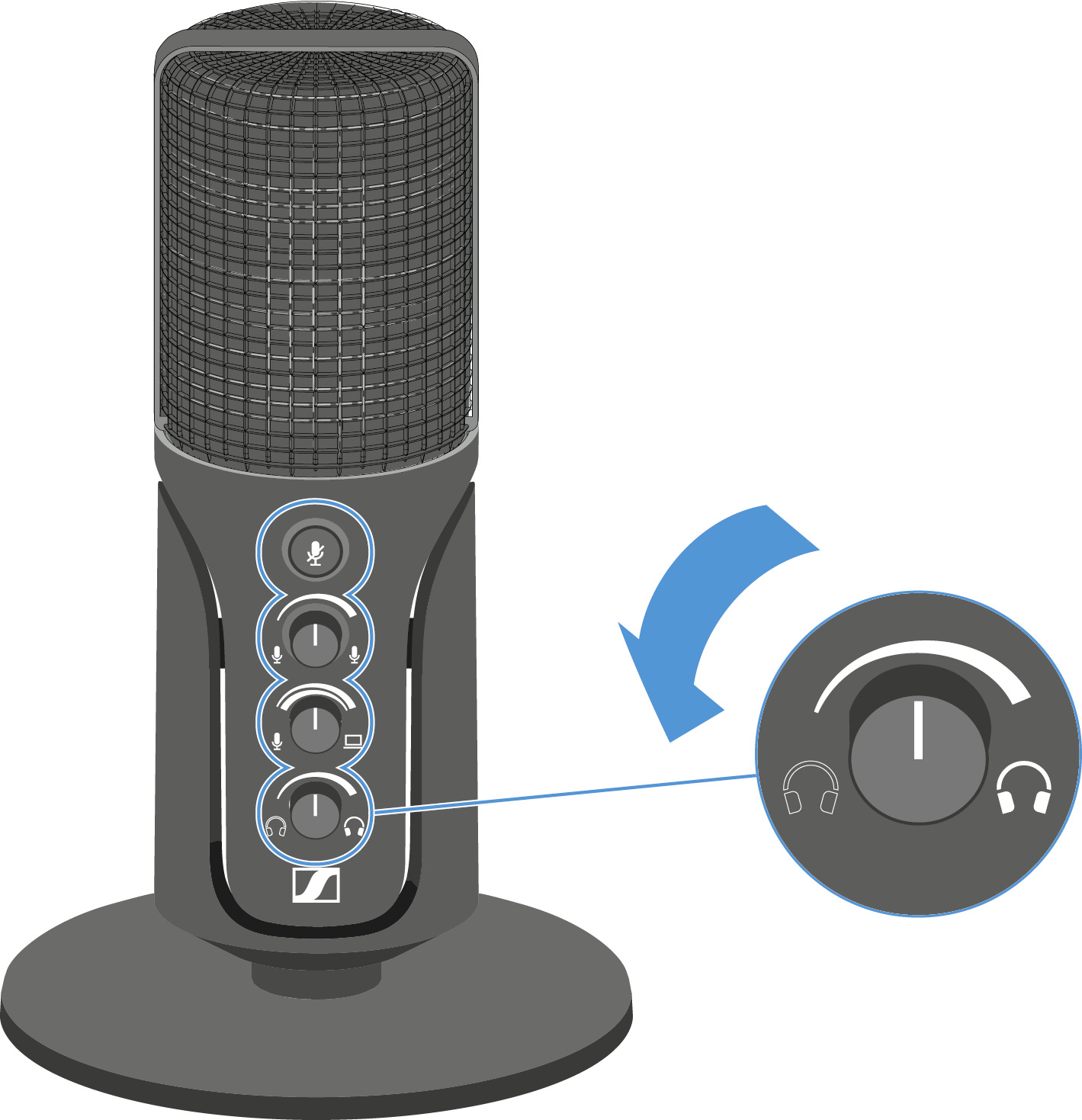 A través de la salida de auriculares de la parte posterior del micrófono (jack de 3,5 mm) puede escuchar la señal de audio mezclada del micrófono y la reproducción a través de la conexión USB tipo C (señal de audio del PC/dispositivo móvil).