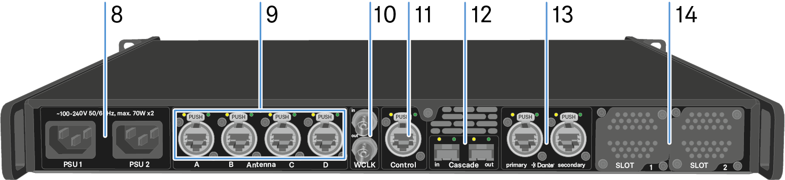 - 13 2 puertos resistentes RJ45 para entrada Dante® primaria/secundaria