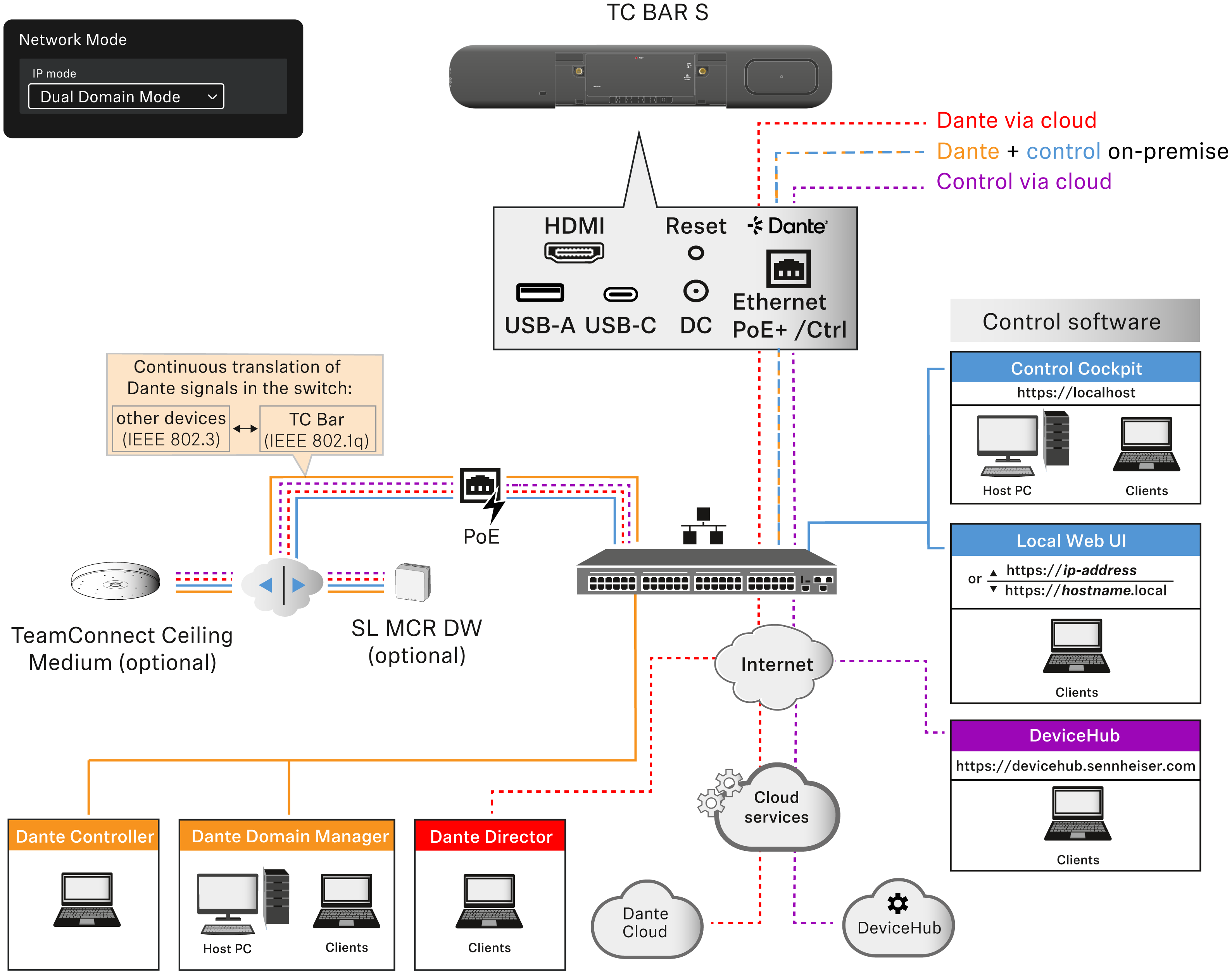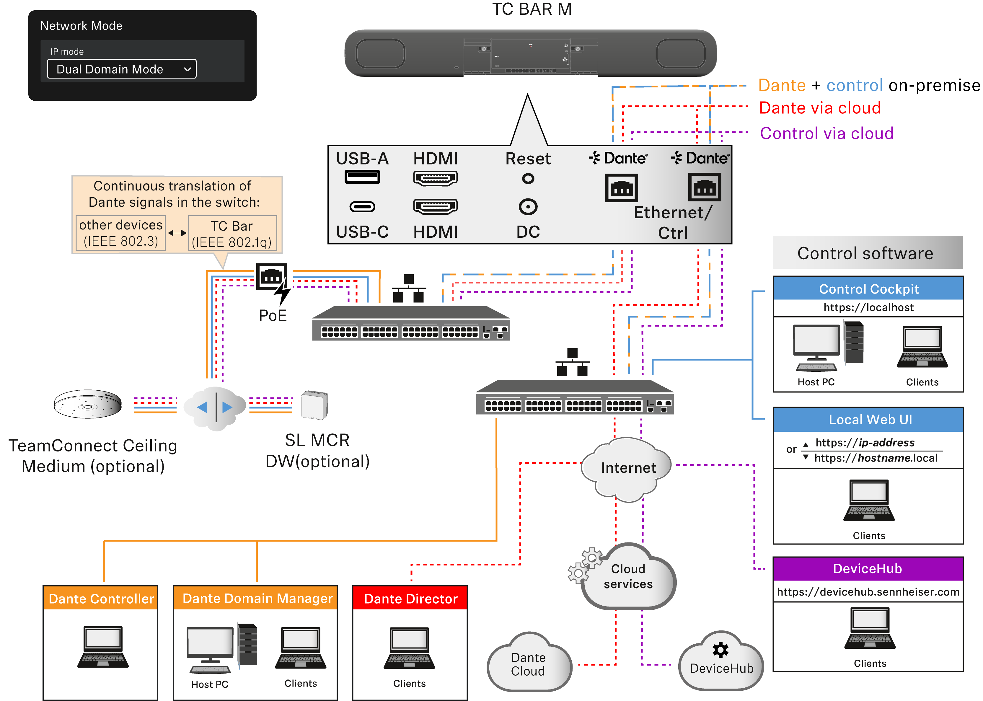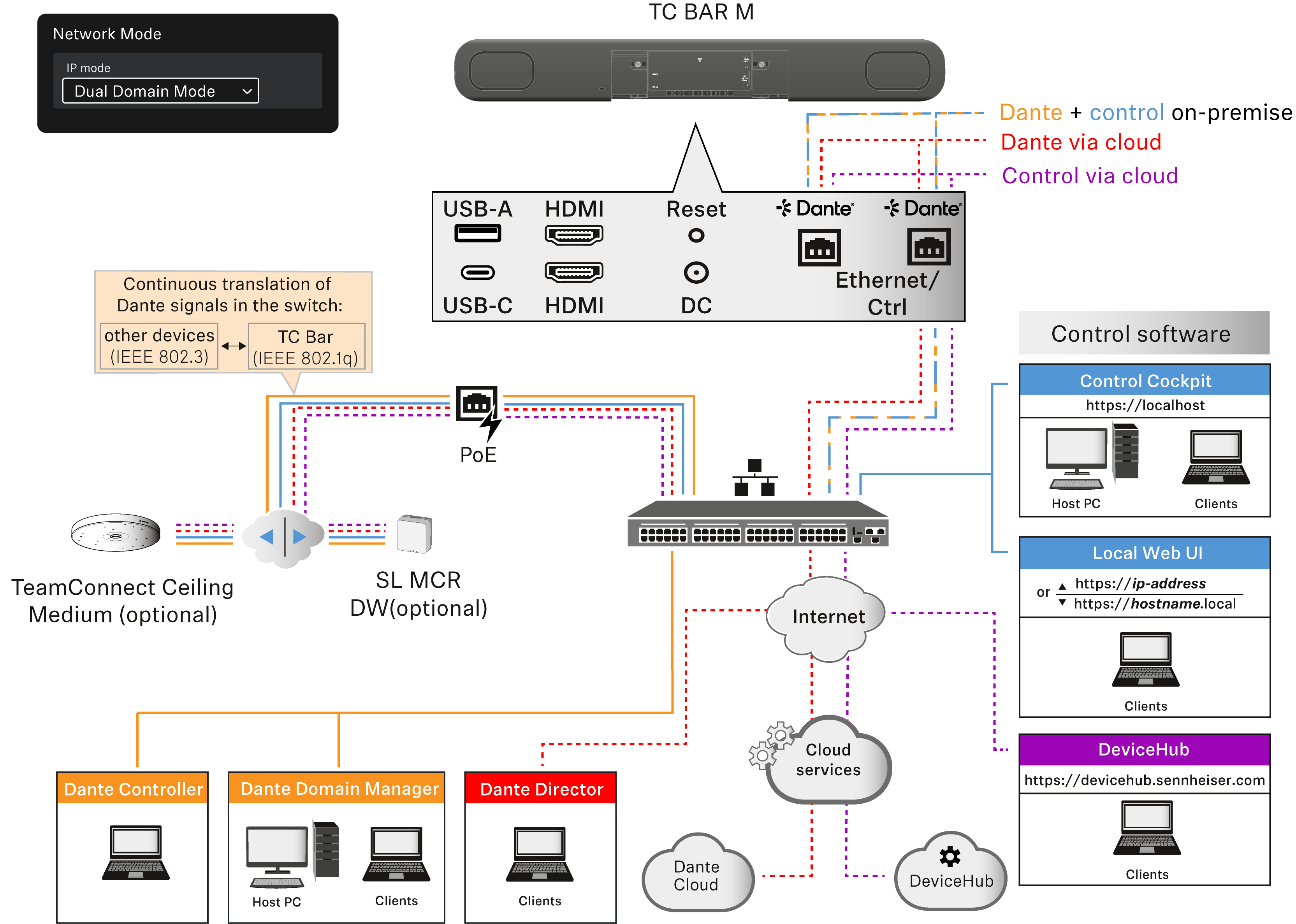 - Cualquier ampliación conectada se puede gestionar tanto a través del Dante Controller como del Control Cockpit, ya que el TC Bar M trasmite las señales por medio del conmutador integrado.