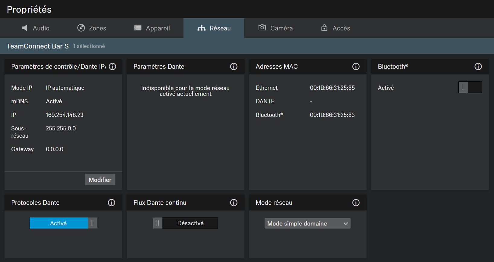 Les réglages réseau suivants sont disponibles pour la TC Bar.