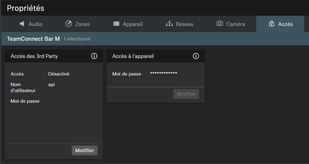 L’accès au contrôle multimédia par des appareils tiers pour la TeamConnect Bar est chiffré et protégé au moyen d’un nom d’utilisateur et d’un mot de passe. Il doit être activé au moyen du logiciel Control Cockpit avant de pouvoir être utilisé.