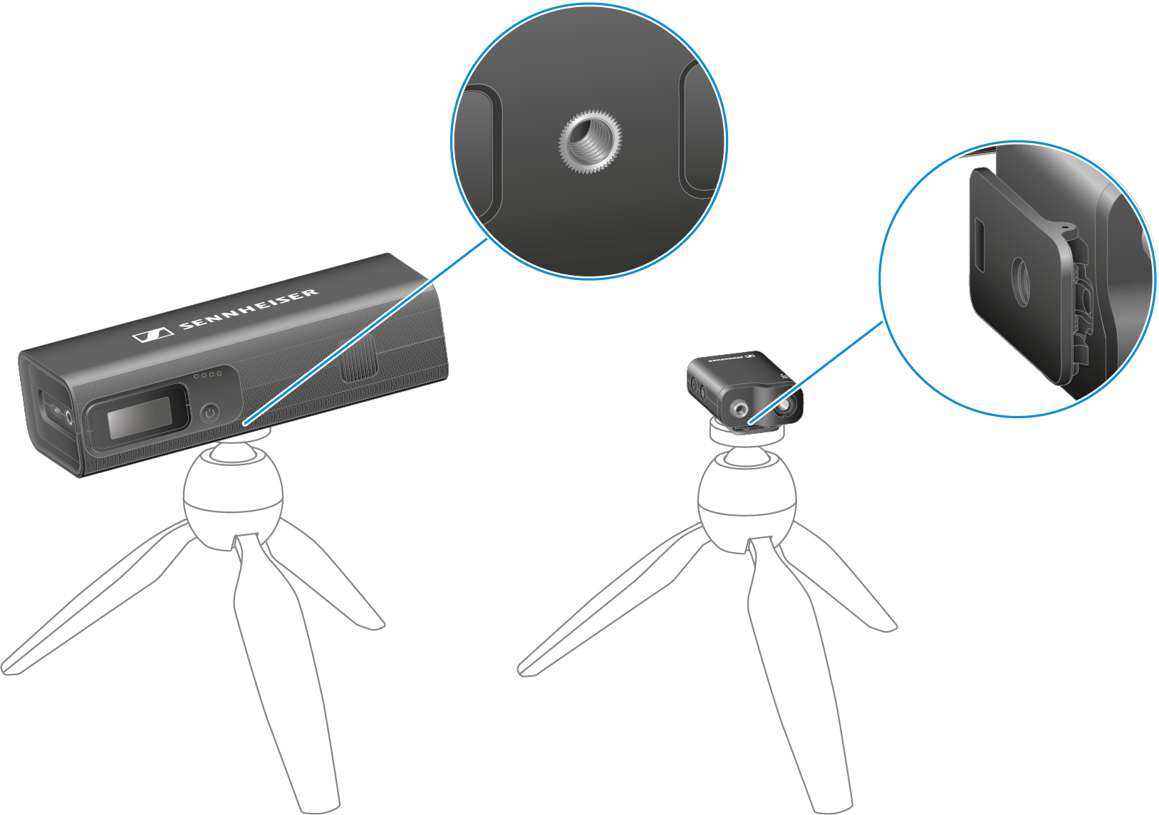 Utilisez le filetage situé sur la face inférieure de la Charging Bar ou le filetage au niveau du clip du Transmitter pour y fixer un trépied.