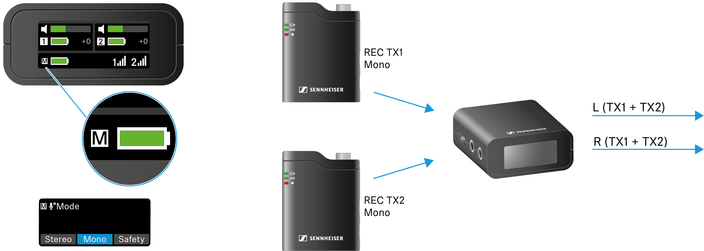 - Le mode mono convient parfaitement lorsque vous souhaitez utiliser une sortie audio symétrique (gauche/droite) au niveau d’un appareil (par exemple, une caméra ou un smartphone) qui ne prend en charge qu’un seul canal d’entrée. Ici, les signaux des deux Transmitters sont mélangés dans le Receiver et mis à disposition en tant que signal identique sur les sorties gauche et droite du Receiver. Il est toutefois impossible de traiter séparément les signaux audio des Transmitters lors de la phase de post-production.