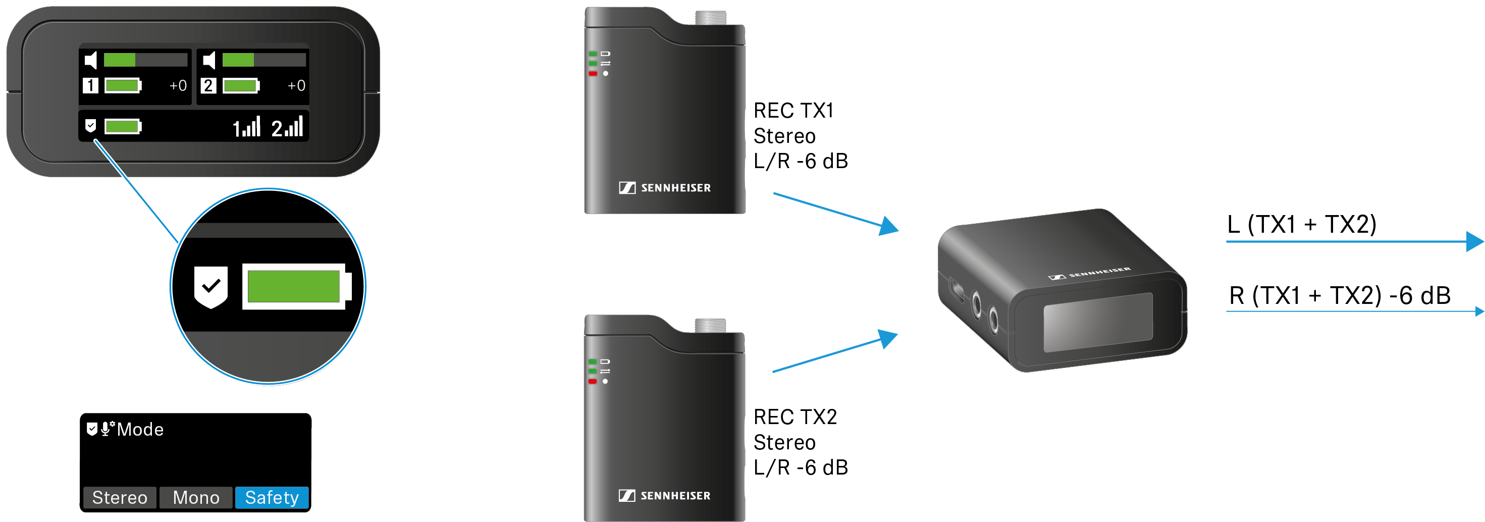 - Le mode sécurité fonctionne essentiellement comme le mode mono, mais ici, pour le signal audio mixte provenant de la sortie du Receiver, le canal droit émet à -6 dB. Cette piste plus silencieuse offre une sécurité au cas où le son serait saturé lors de l’enregistrement sur la caméra.