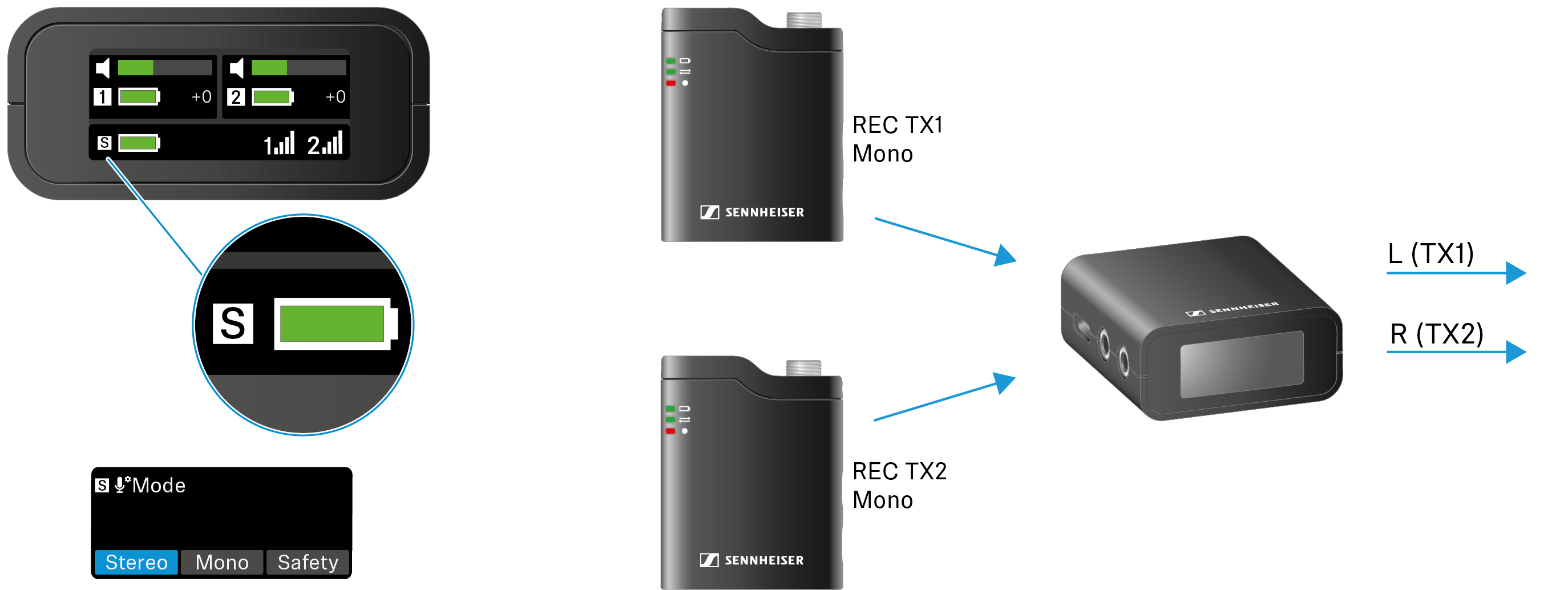 - En mode stéréo, le signal audio des deux Transmitters est émis séparément par le Receiver via la sortie audio (analogique et numérique) (TX 1 gauche/TX 2 droite). Dans ce mode, l’audio des deux Transmitters de votre caméra, de votre appareil intelligent ou de votre ordinateur est donc enregistré sous forme de piste distincte et peut être traité individuellement lors de la phase de post-production.