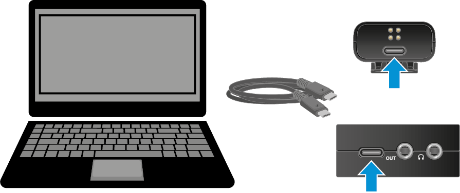함께 배송된 USB-C 케이블을 사용하여 Receiver와 Transmitter를 PC 또는 Mac에 연결할 수 있습니다. 이를 통해 녹음에 액세스하거나 펌웨어 업데이트를 실행할 수 있습니다(업데이트 또는 리셋 실행 참조).