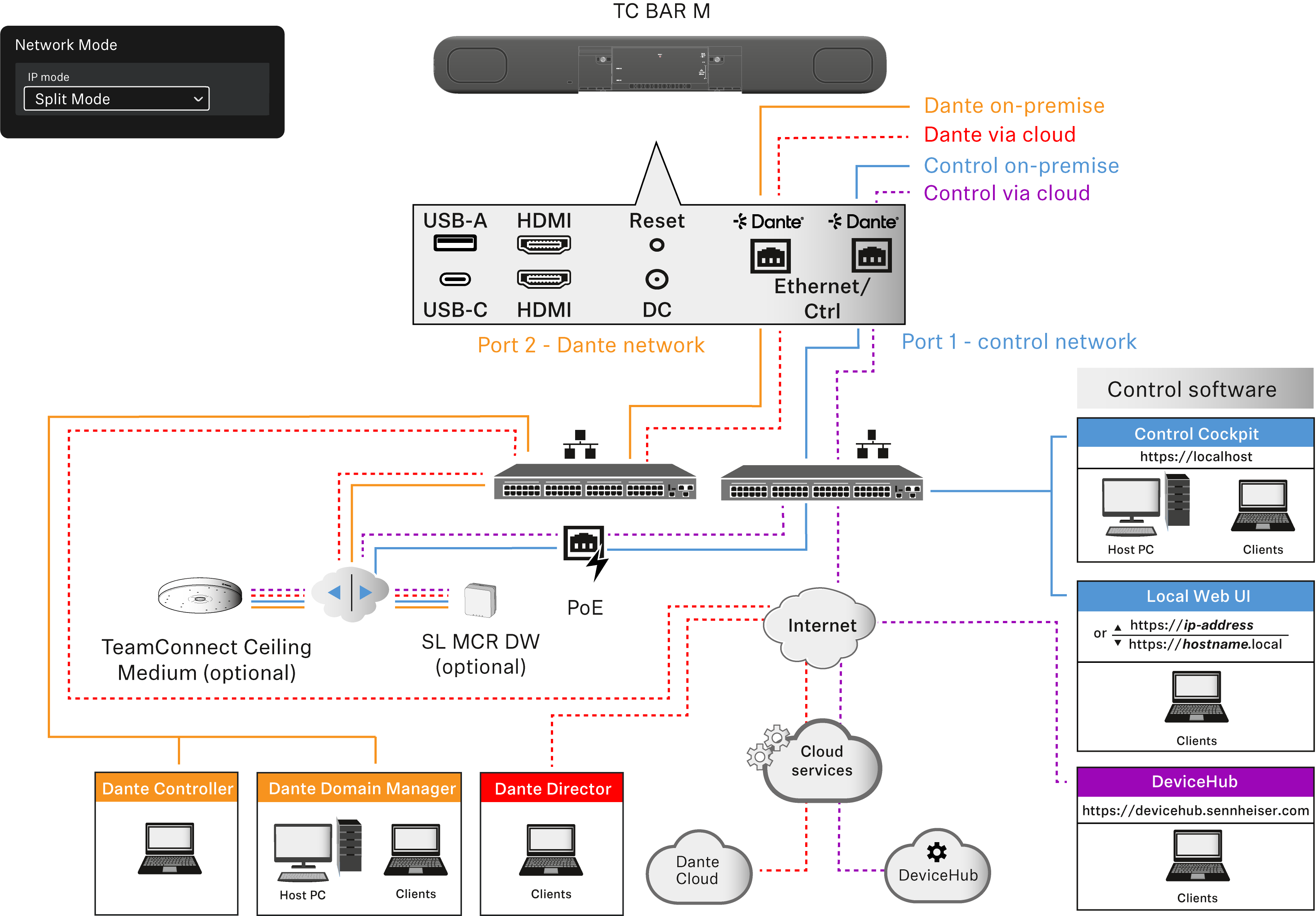 TC Bar의 두 개의 서로 다른 연결을 사용하여 Dante® 네트워크와 제어 네트워크를 제어하려는 경우