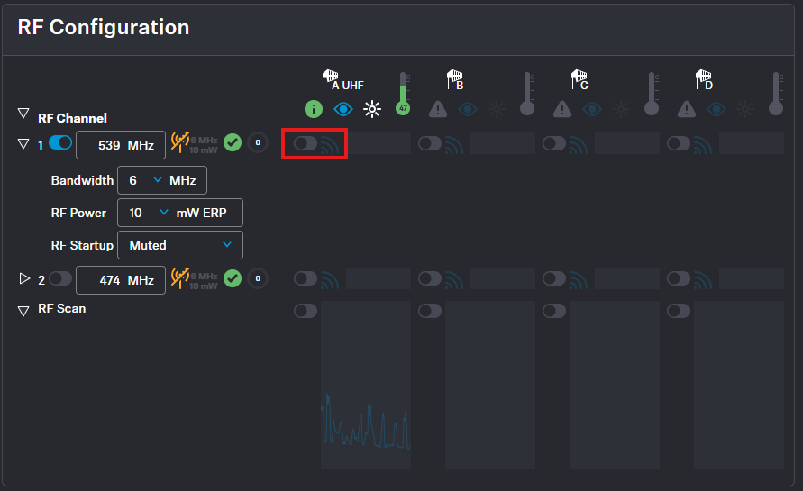 Na linha do seu canal RF, clique no botão de alternância ao lado do ícone de utilização e interferência
