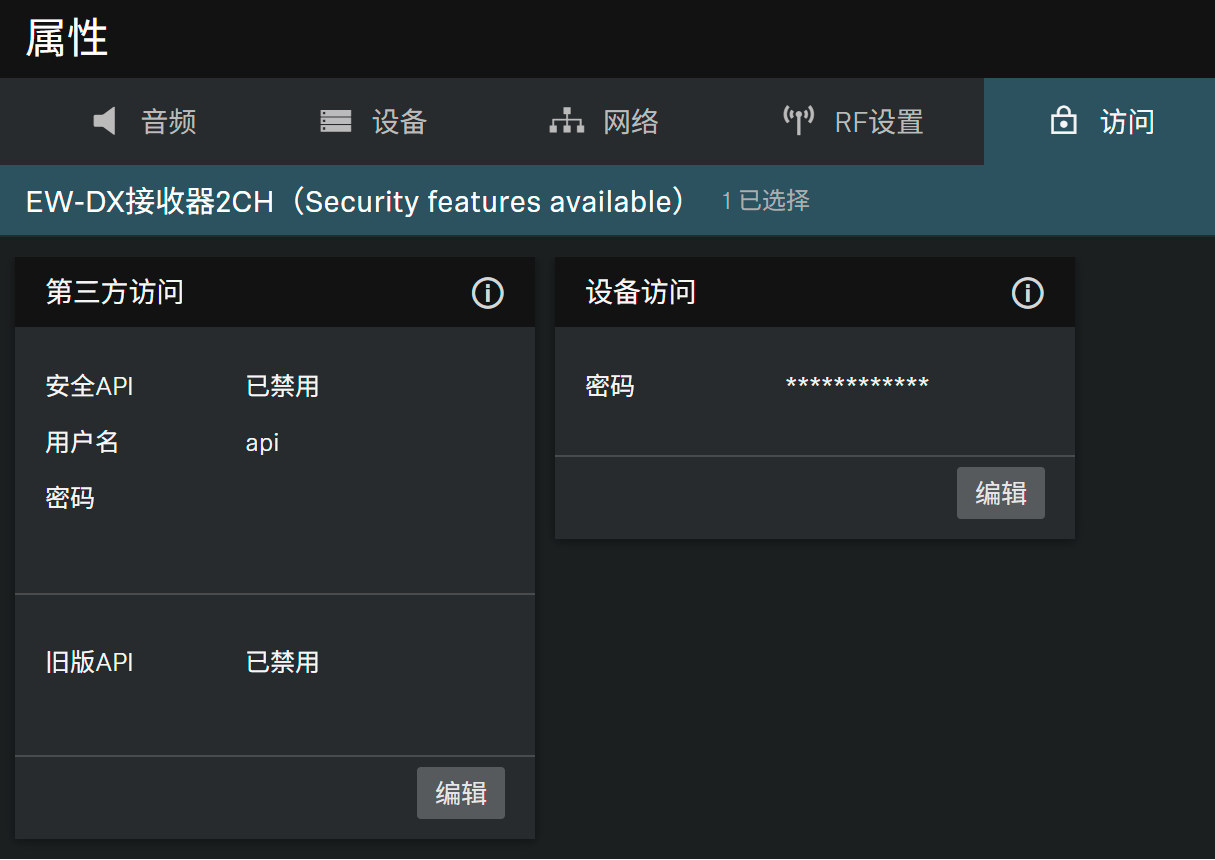更改设备访问的密码,Control Cockpit使用该密码对设备进行身份验证。EW-DX接收器的默认密码为sennheiser。