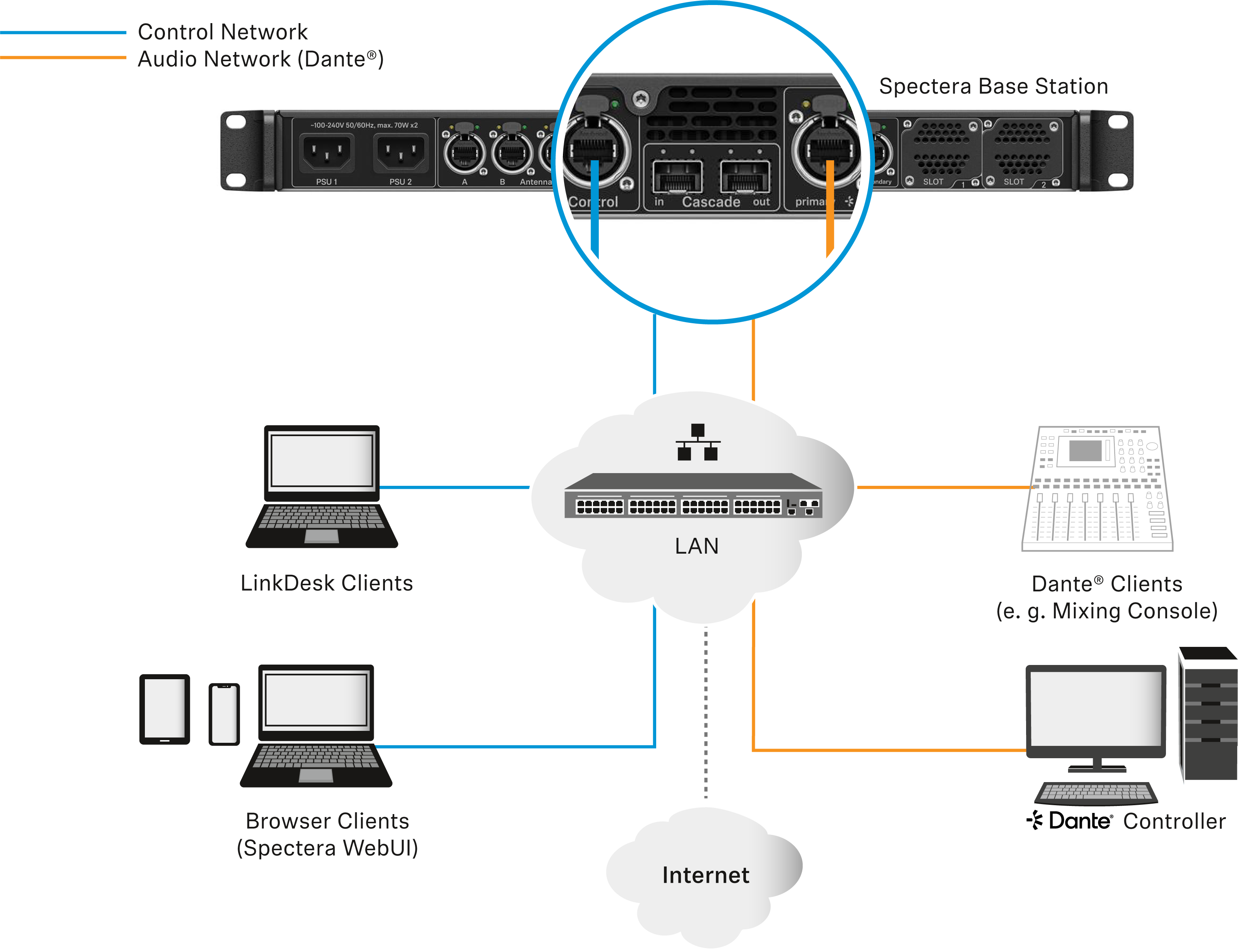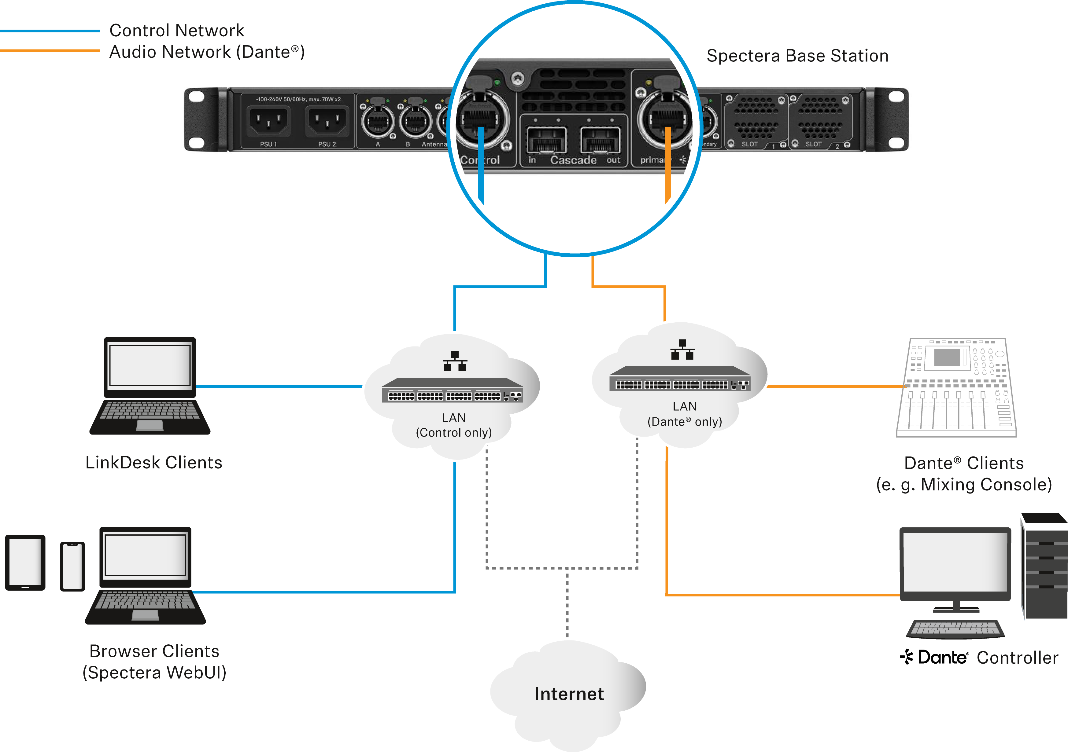 - 通过两个不同的交换机/路由器分别配置控制网络和Dante®网络。