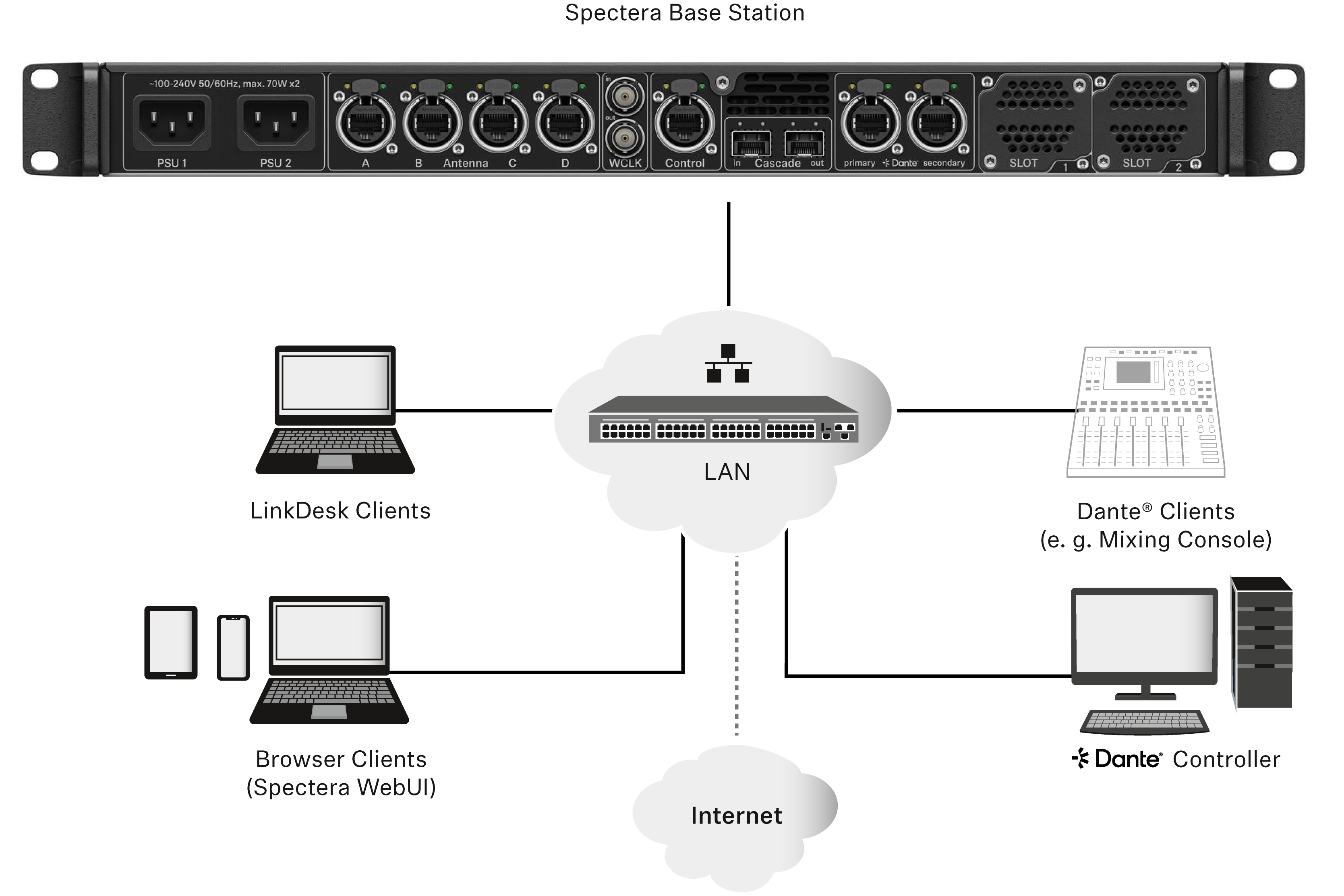 要运行Spectera解决方案的多个组件,需将其集成至现有或新建的网络设置中。下图展示了网络设置及其参与者的总体概览。