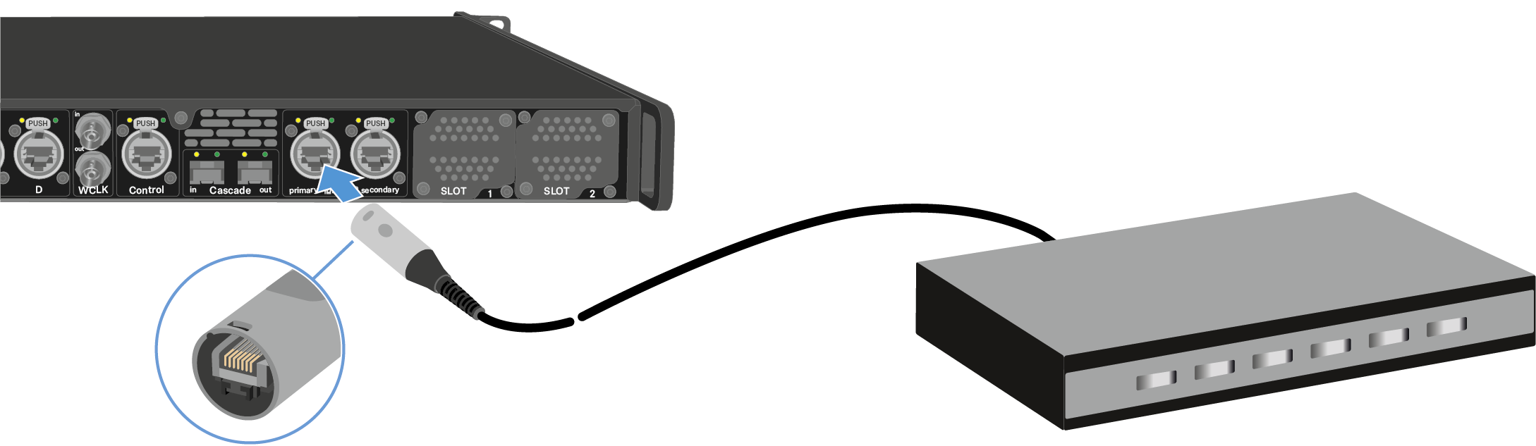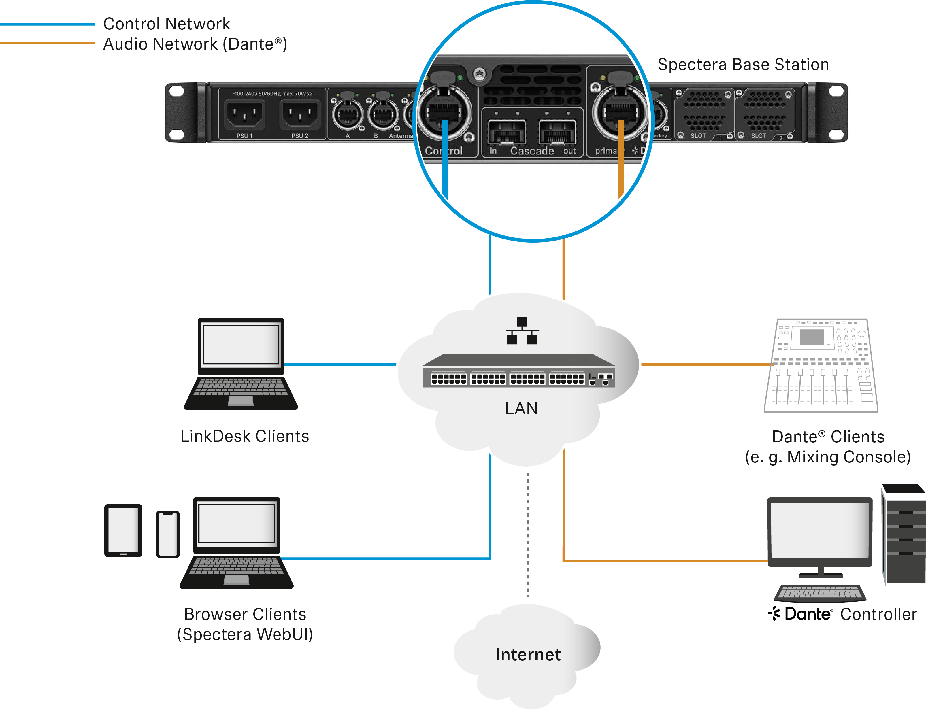 在独立网络模式下,控制网络和Dante®网络使用不同的物理网络基础设施。