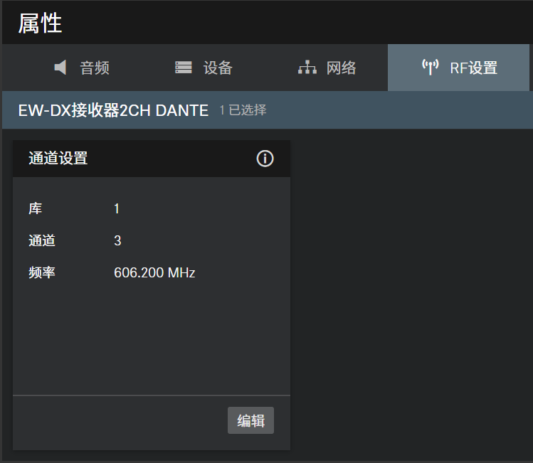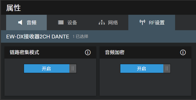 RF设置 点击图像中所需的字段以获取详细信息。 通道设置 显示当前频率,包括库和通道。 连接密度模式 开关连接密度模式。 之后重启设备。 有关连接密度模式的详细信息,请参阅连接密度模式。 音频加密 激活或禁用发射器和接收器之间的AES-256加密。